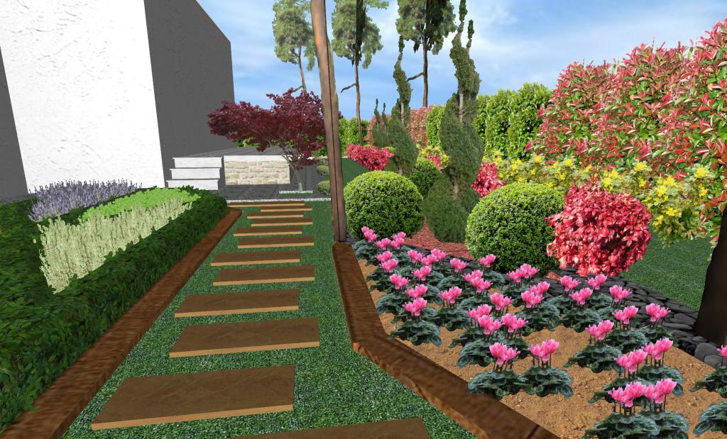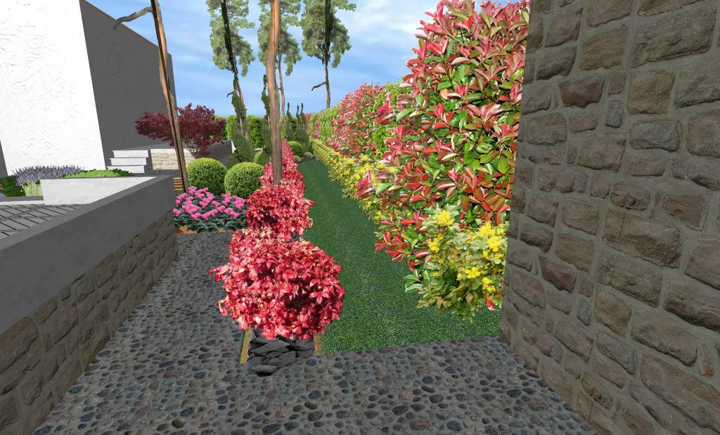 Ιδιωτικός κήπος 140 τ.μ. στη Άνοιξη. Ο κήπος βρίσκεται στη είσοδο δύο νεόδμητων κατοικιών, σε μοντέρνα γραμμή, και τις περισσότερες ώρες της ημέρας σκιάζεται από μεγάλα πεύκα που υπάρχουν στο οικόπεδο.