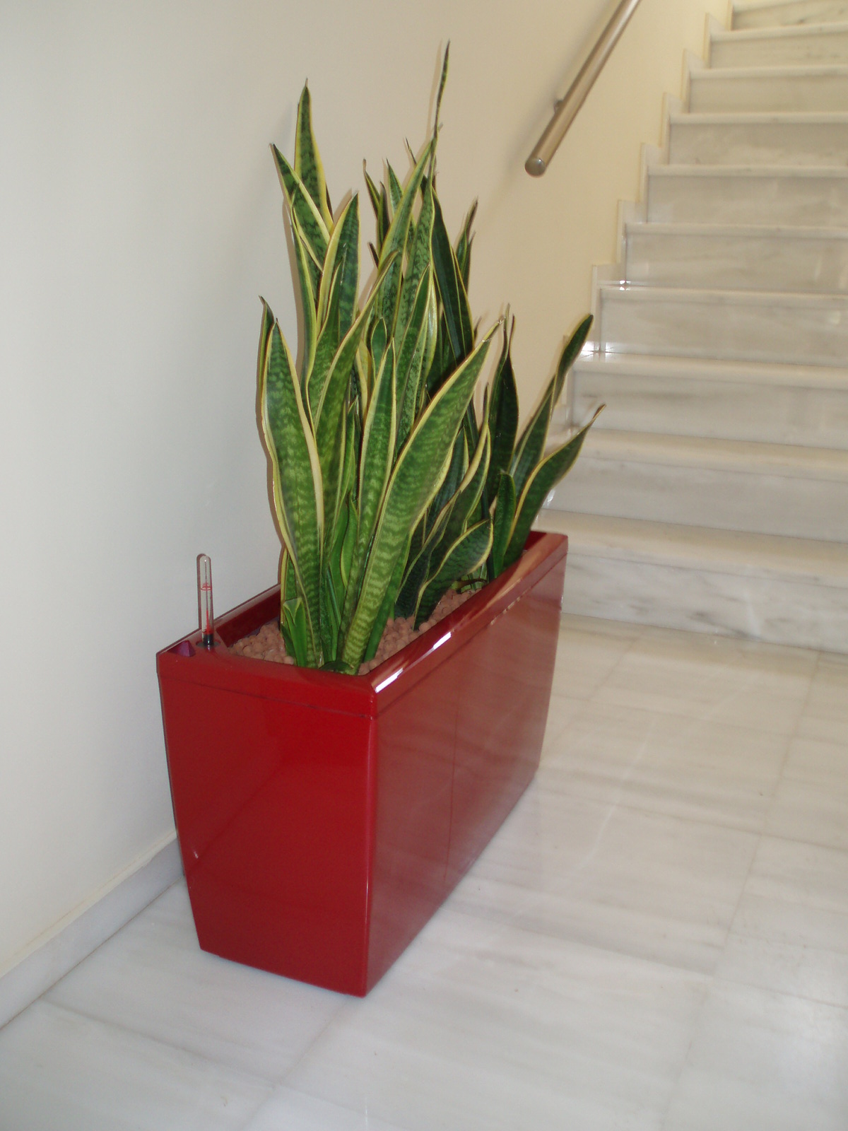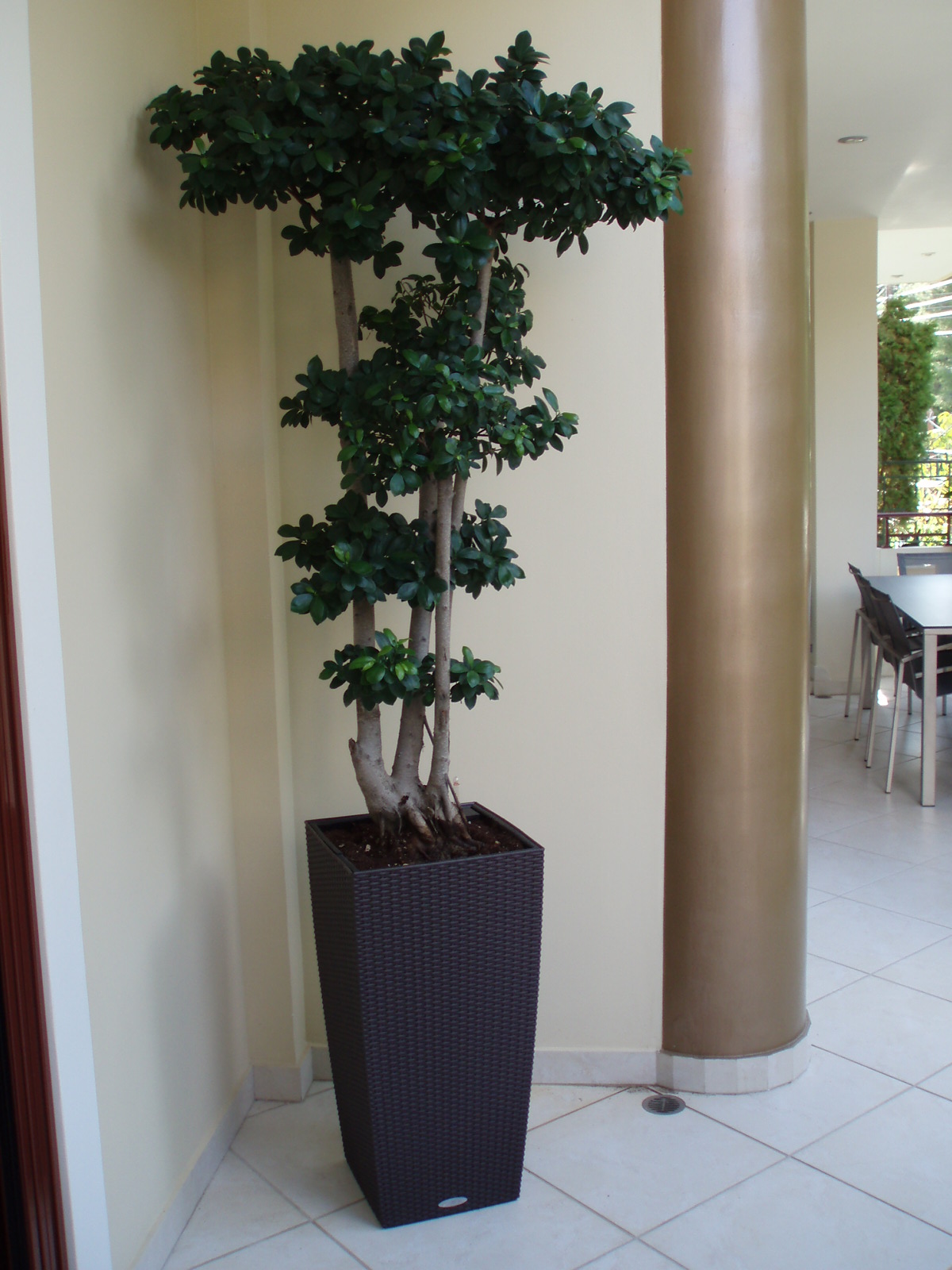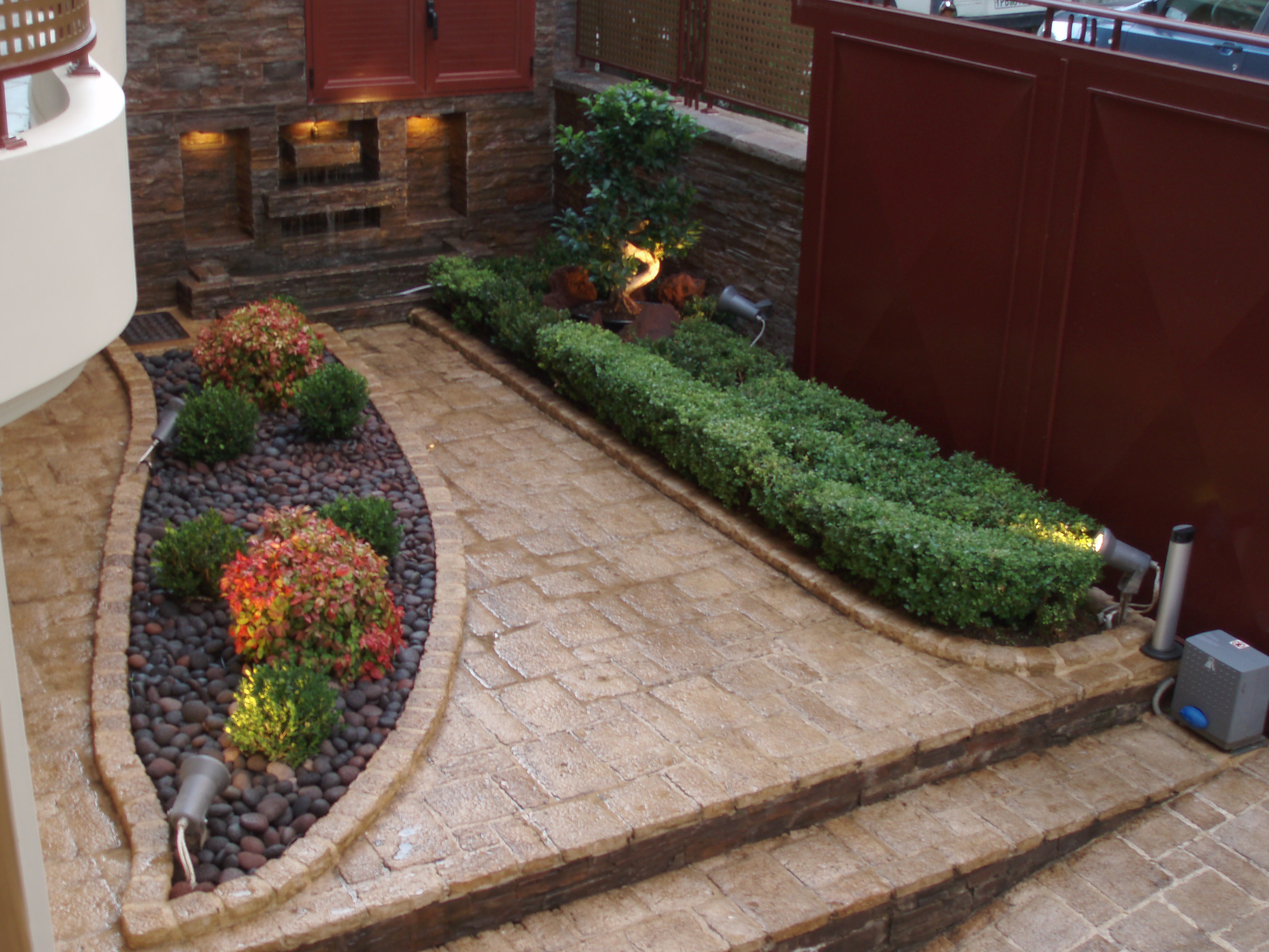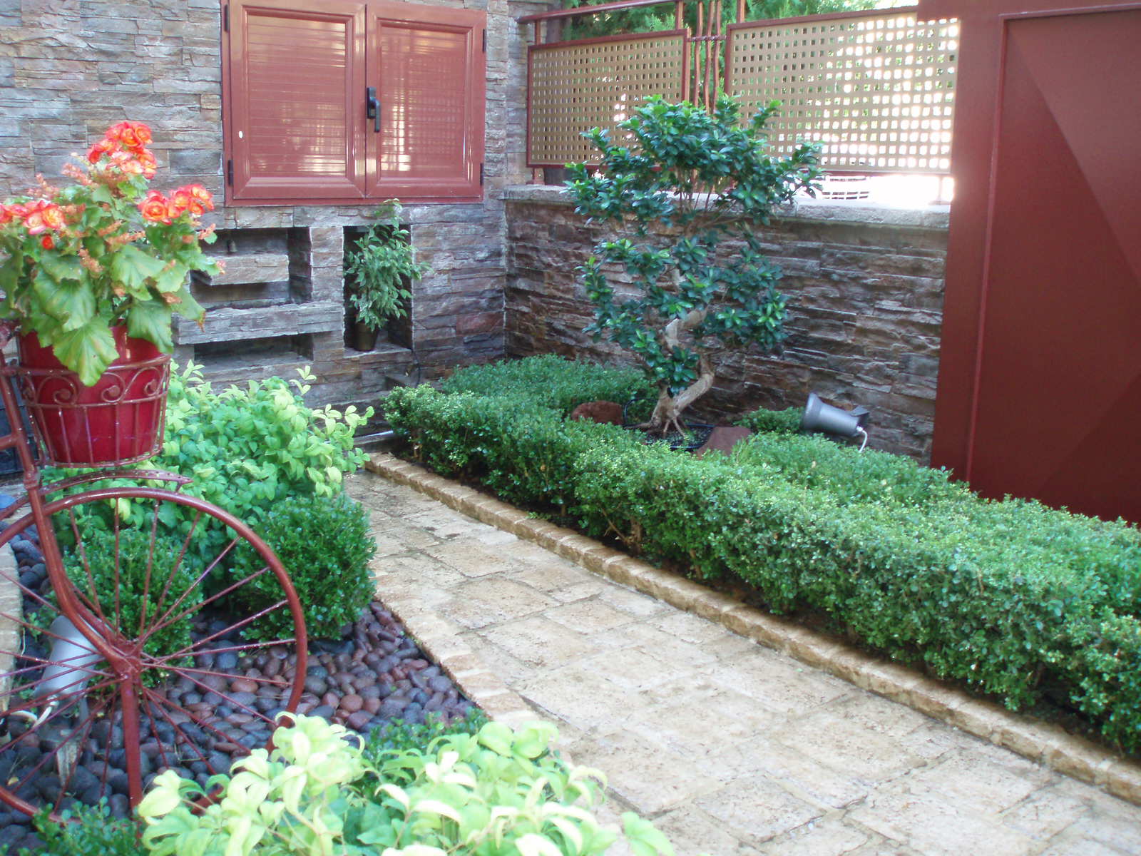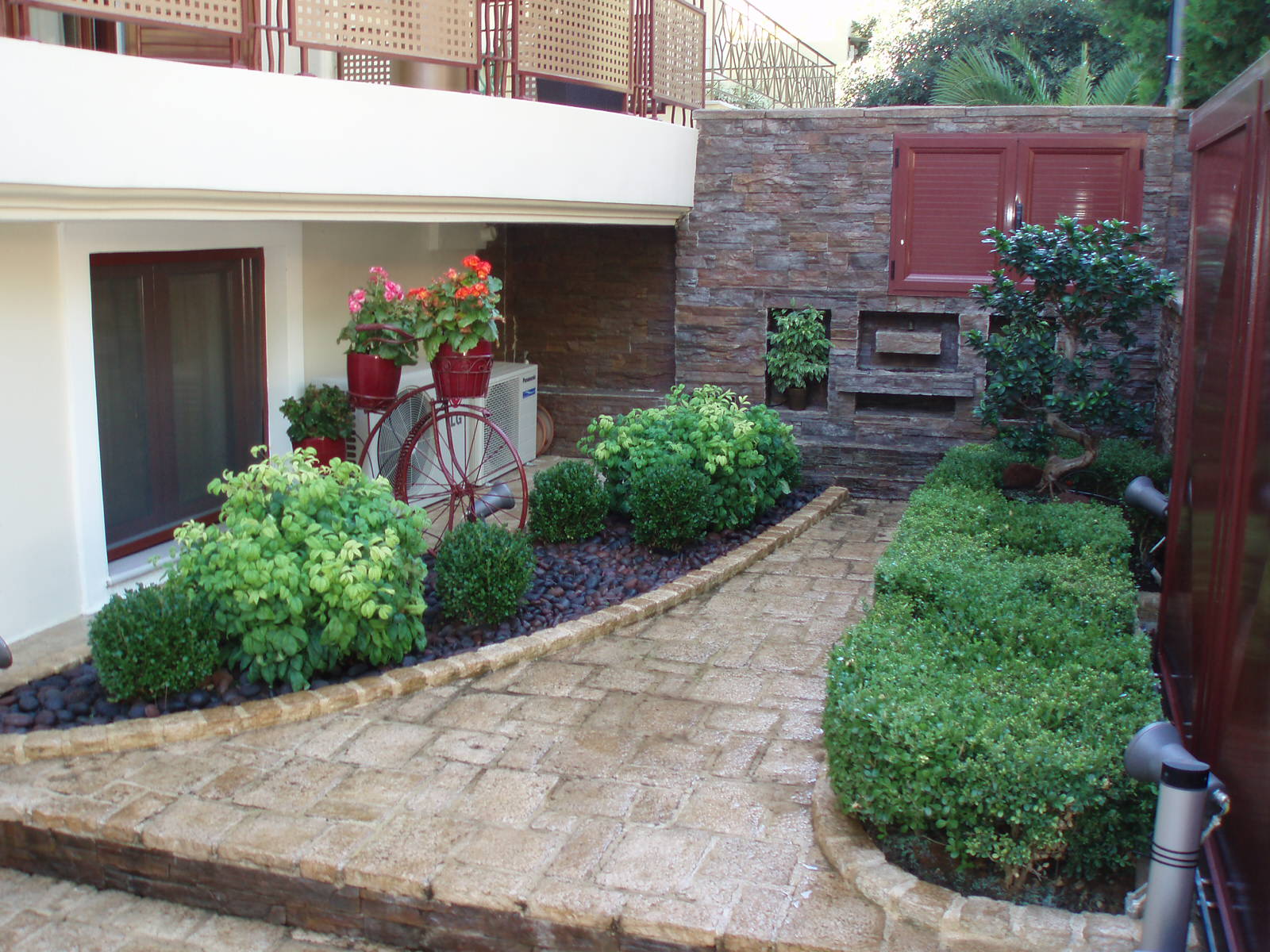 1. Ένα Bonzai Ficus Benjanim – Ανάμεσα σε προϋπάρχοντα Βuxus sempervirens, τα οποία υπέστησαν αυστηρό κλάδεμα μορφοποίησης προκειμένου να διαμορφώσουν ένα «φυσικό» τραπέζι, το Bonzai αναδείχτηκε ως το κεντρικό φυτό των παρτεριών. Γύρω του, τοποθετήθηκαν φυσικές πέτρες λάβας εναρμονίζοντας την σύνθεση με την υπάρχουσα κόκκινη πέτρα της οικίας.