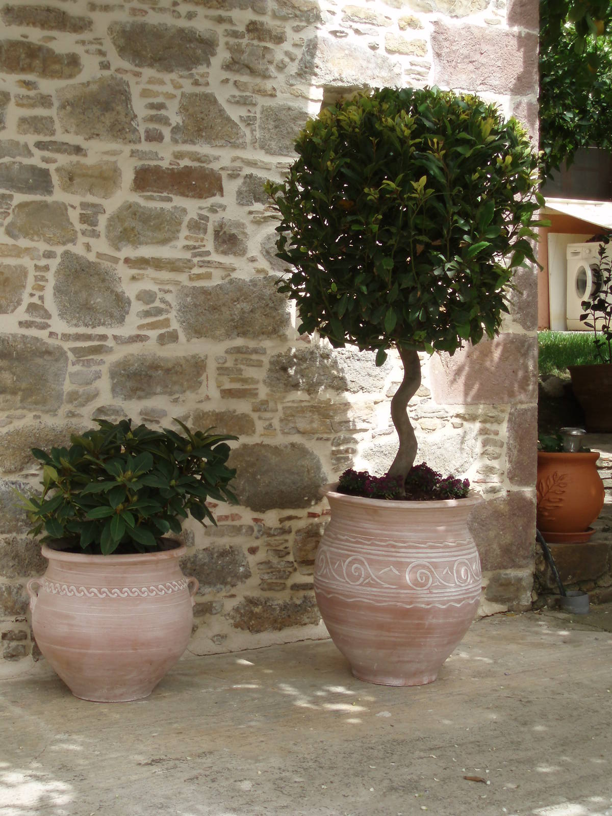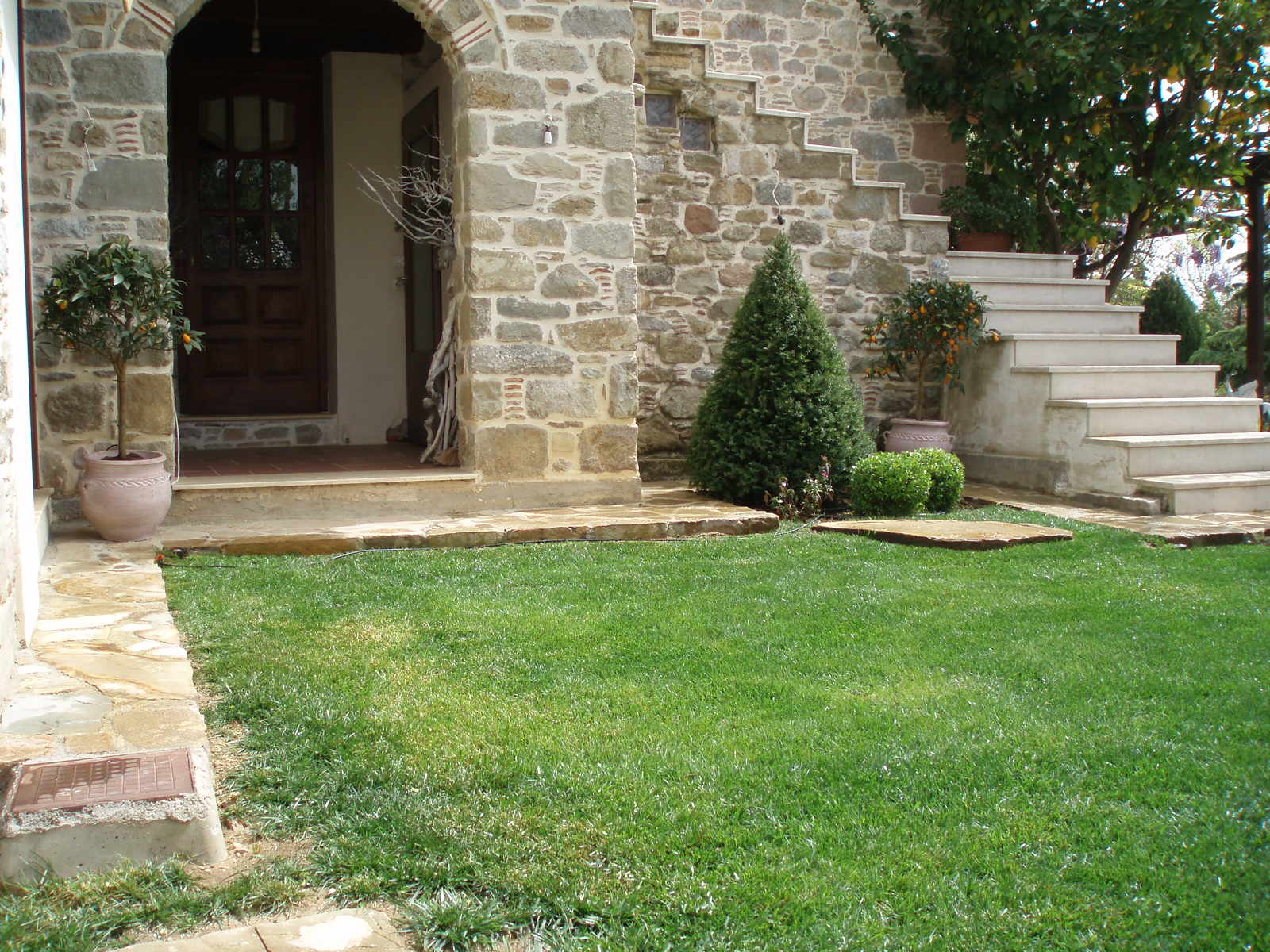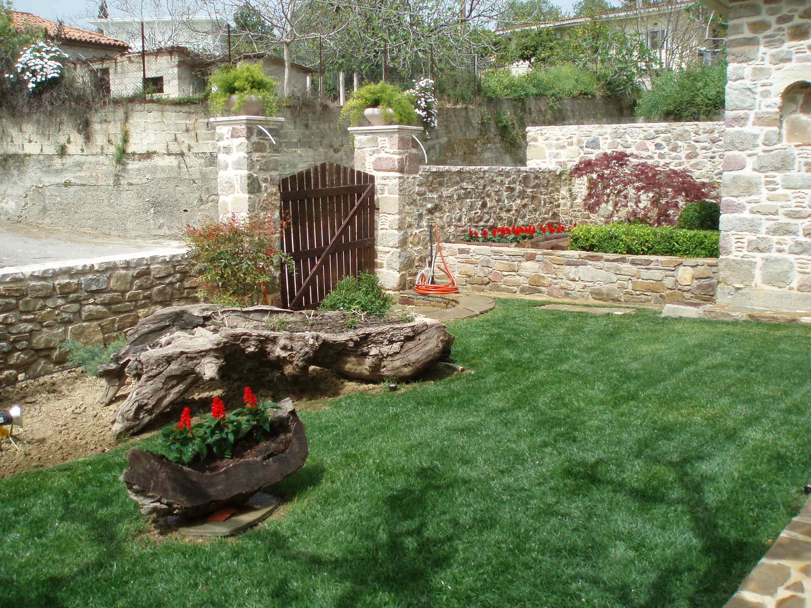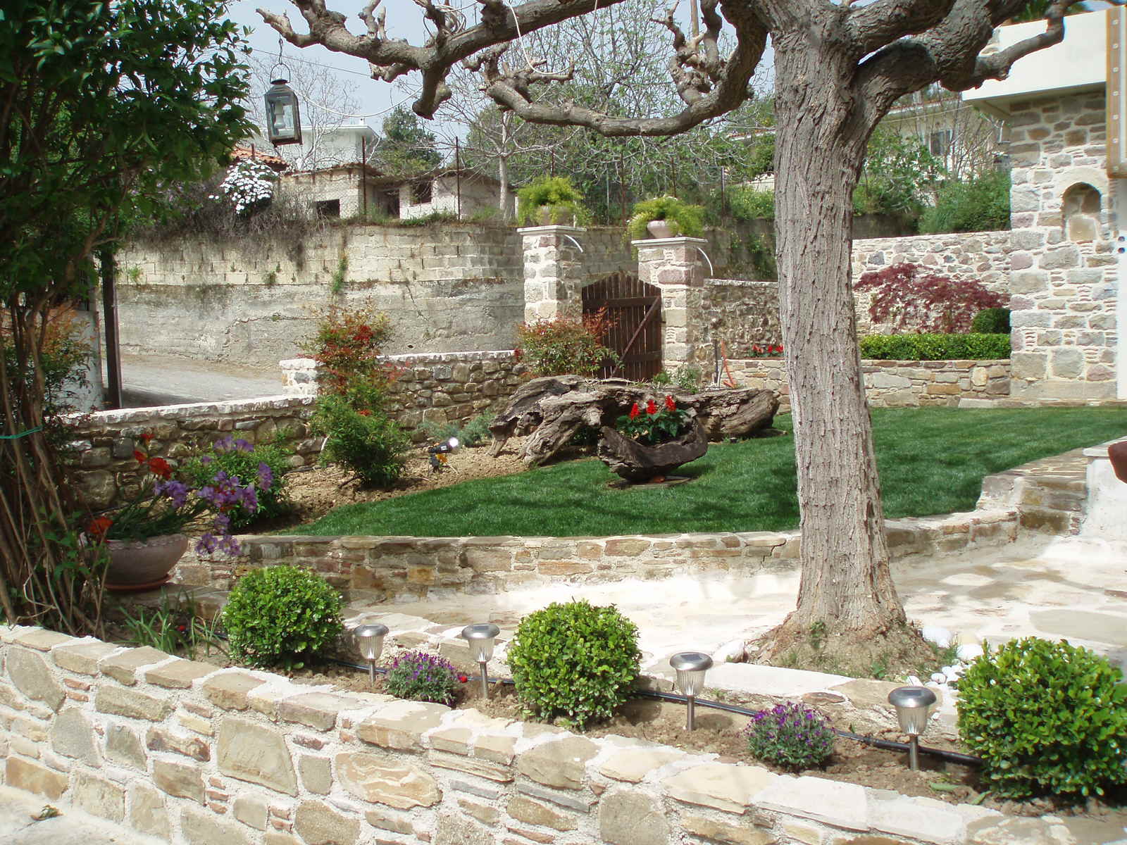 Η επιλογή των φυτών έγινε με κριτήριο την λιγότερη δυνατή συντήρηση, χωρίς όμως να αποκλείσουμε την επιλογή «ιδιαίτερων» καλλωπιστικών φυτών ή δέντρων και ξεχωριστών «σκληρών» υλικών , όπως λόγου χάρη το πανέμορφο δέντρο Acer Palmatum “dissectum Garnet”, που δεσπόζει στο κέντρο του υπερυψωμένου παρτεριού, πλαισιωμένο από κομμένους κορμούς Κυπαρισσιών, πυκνή φύτευση από Πυξάρια και Ιβίσκους κόκκινους με διπλό άνθος. Η παρουσία των εποχιακών φυτών είναι αναμενόμενη και επιτακτική! Ο Τάξος Πυραμίδα και τα 2 Μπούξους μπάλα , τονίζουν την γωνία δίπλα στην σκάλα, ενώ οι πήλινες γλάστρες με τα Κουμ-Κουάτ δίνουν χρώμα στις γωνίες, εναρμονίζονται με τα υπάρχοντα εσπεριδοειδή του κτήματος και ενισχύουν το ελληνικό τοπίο. Στον πέτρινο τοίχο της οικίας, οι Ναντίνες πλαισιώνονται από γλαυκούς, πλαγιόκλαδους Γιουνίπερους ενώ ο φυσικός κορμός του ξύλου ταιριάζει έξοχα με τον πέτρινο τοίχο και αποτελεί αναπόσπαστο διακοσμητικό στο φυτεμένο κομμάτι του κήπου. Ροδόδεντρα κόκκινα και Δάφνες Απόλλωνος spiral μέσα σε διαφορετικού μεγέθους πήλινες γλάστρες καλωσορίζουν τον επισκέπτη από την δεύτερη είσοδο της οικίας.
