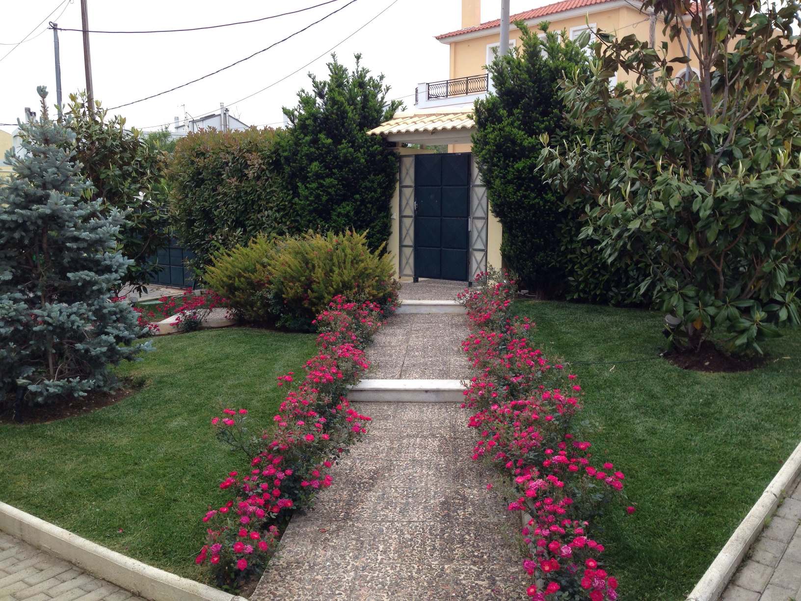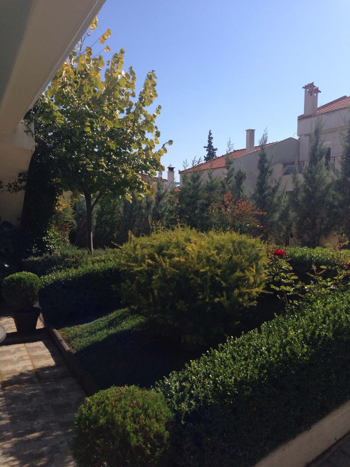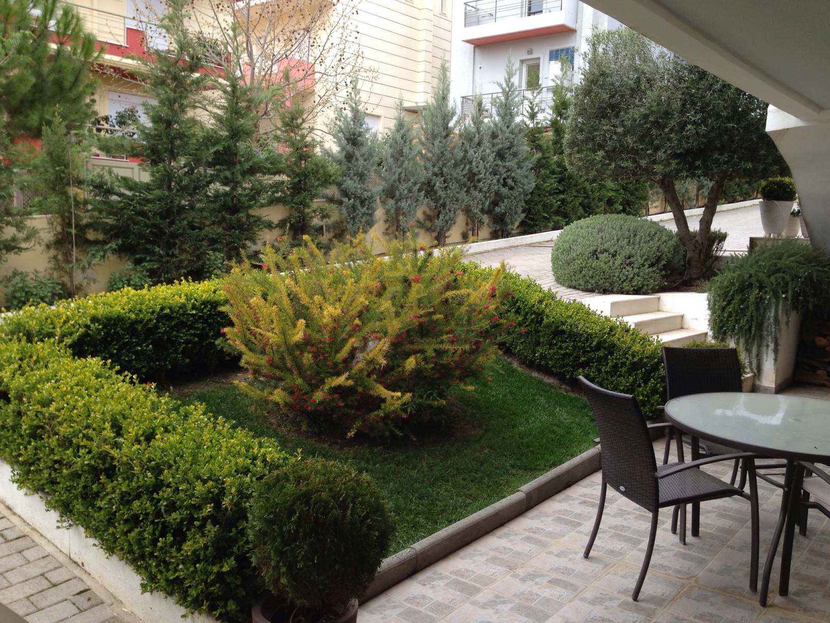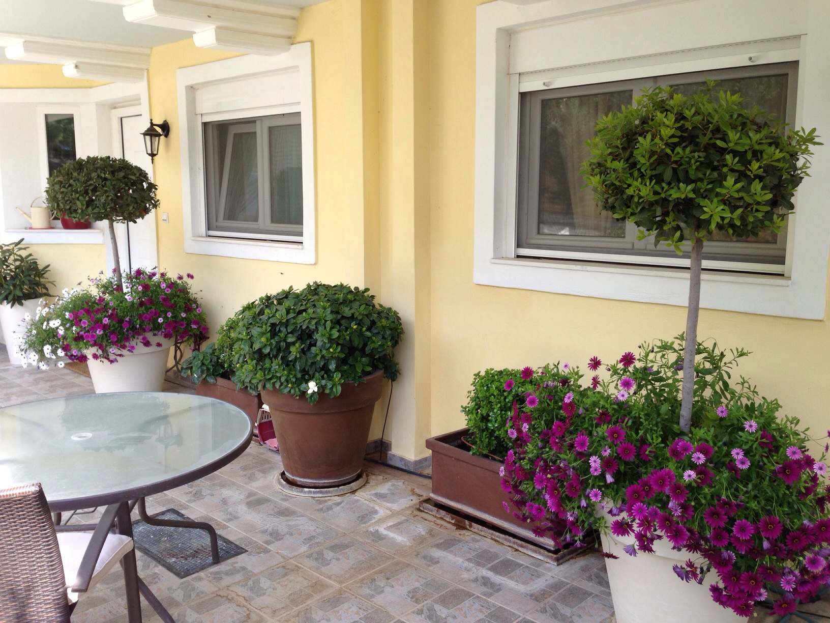 - Γλάστρες με Μπούξους μπάλα, Δάφνες Απόλλωνος ,Διμορφοθήκες και στο κέντρο μια Γαρδένια compacta!!!