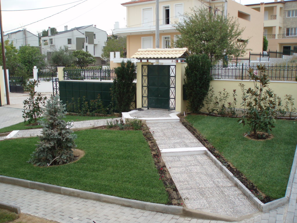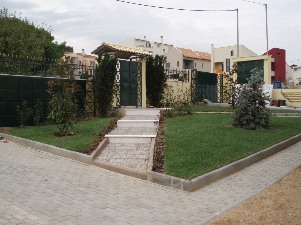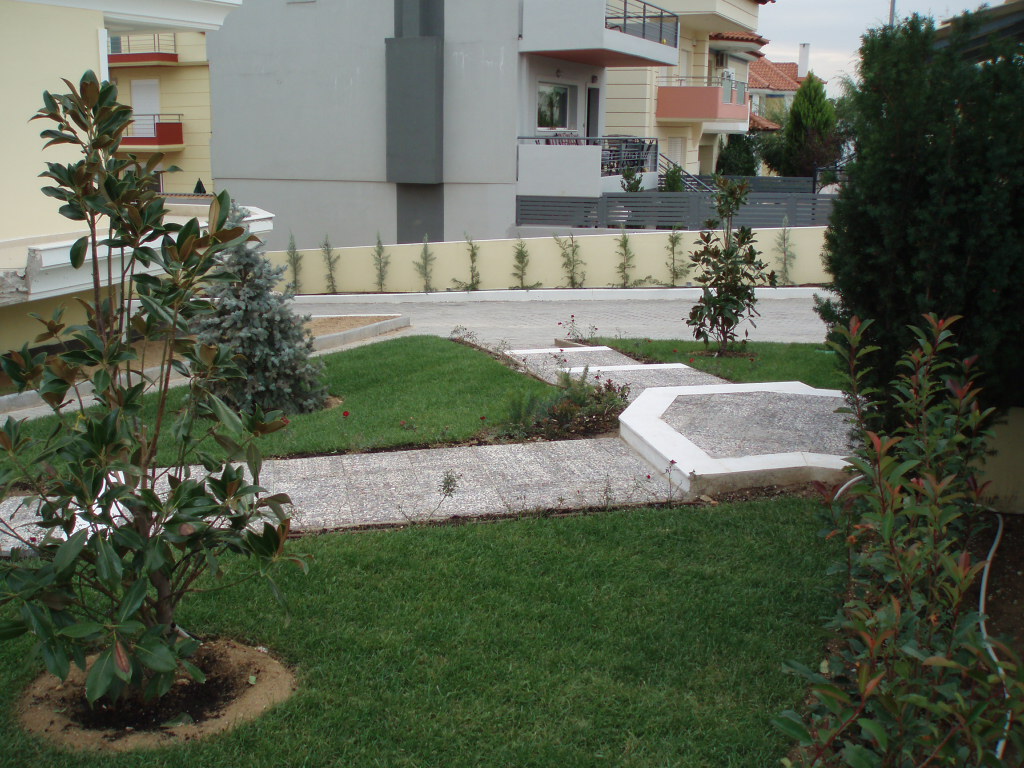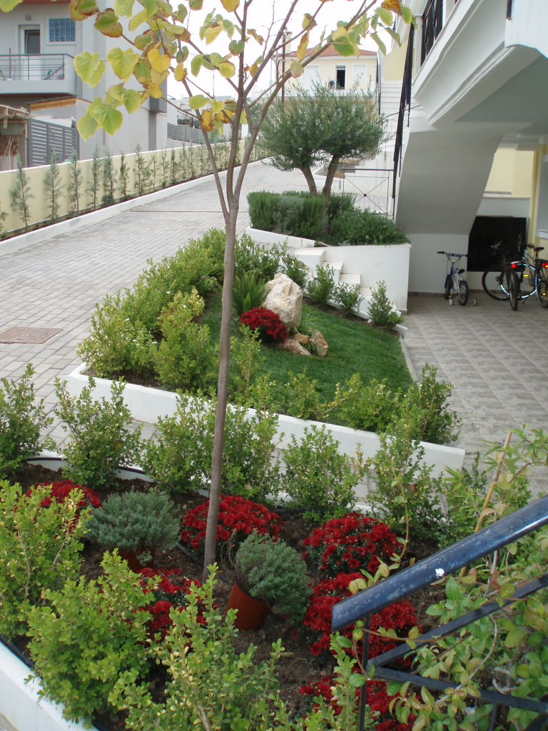 Εσωτερικά , κάθε μεζονέτα φτιάχτηκε κατ’επιλογή του εκάστοτε ιδιοκτήτη με την απαραίτητη συνδρομή μας , σε συνδυασμό πάντα με τους κοινόχρηστους χώρους. ’Ετσι, χρησιμοποιήθηκαν Ελιά ,Τιλιά, Πλάτανος ως κεντρικά φυτά, Βuxus sempervirens, Mahonia, Grevillea, Nandina domestica, Photinia, Lucidum, Cydonia, Eleagnus κλπ.
