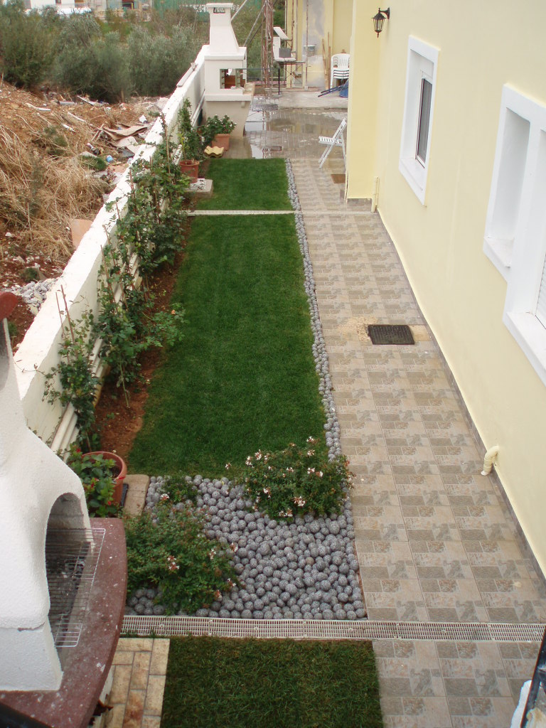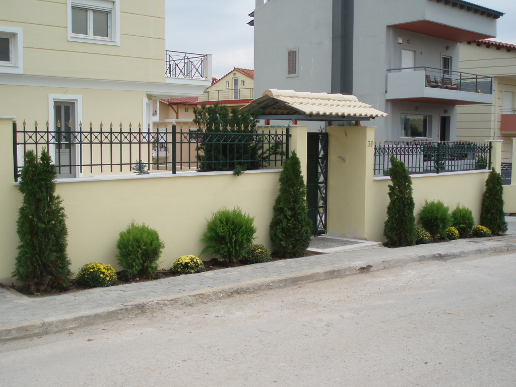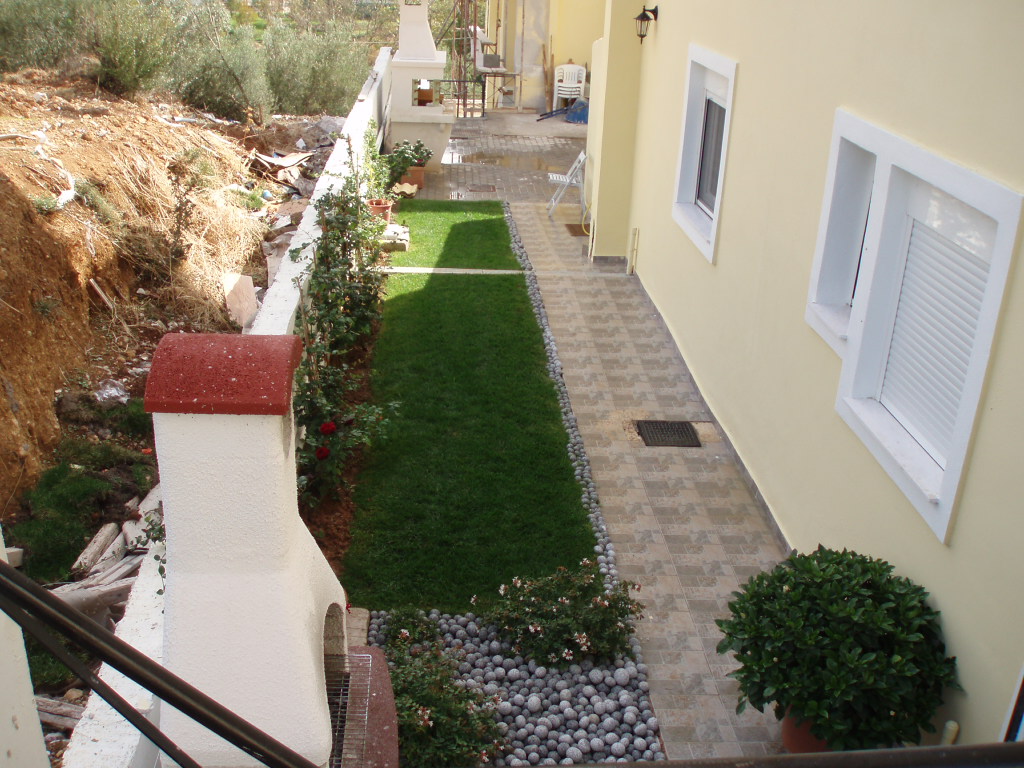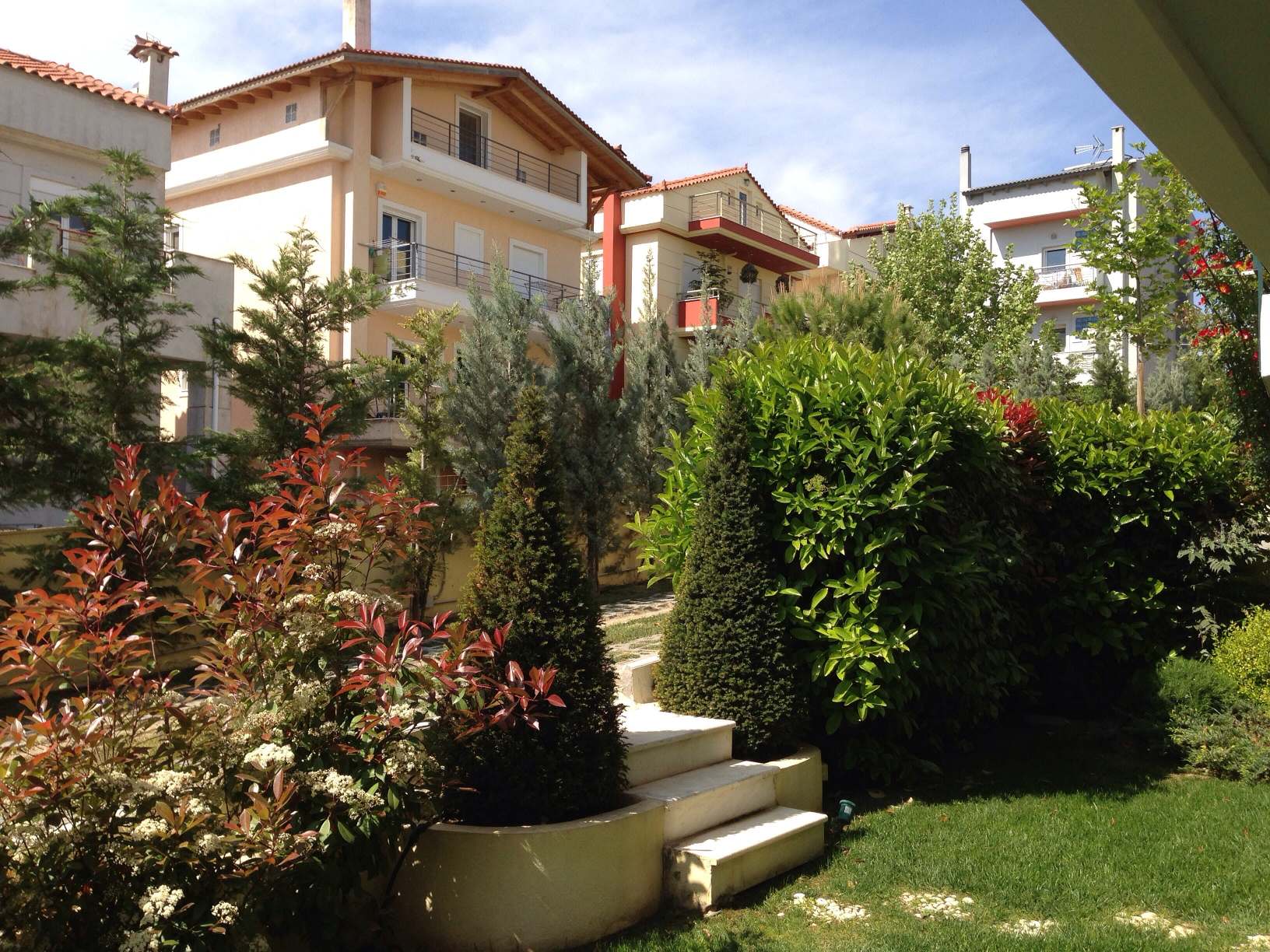 Εσωτερικά , κάθε μεζονέτα φτιάχτηκε κατ’επιλογή του εκάστοτε ιδιοκτήτη με την απαραίτητη συνδρομή μας , σε συνδυασμό πάντα με τους κοινόχρηστους χώρους. ’Ετσι, χρησιμοποιήθηκαν Ελιά ,Τιλιά, Πλάτανος ως κεντρικά φυτά, Βuxus sempervirens, Mahonia, Grevillea, Nandina domestica, Photinia, Lucidum, Cydonia, Eleagnus κλπ.