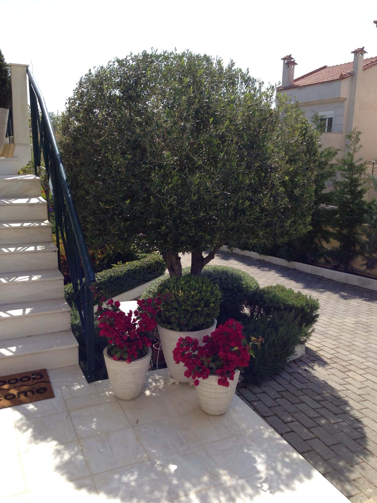 - Ελιά και σύνθεση γλαστρών με Μπούξους μπάλα , Μπουκαμβίλια νάνα σε πήλινες γλάστρες στην βάση της.