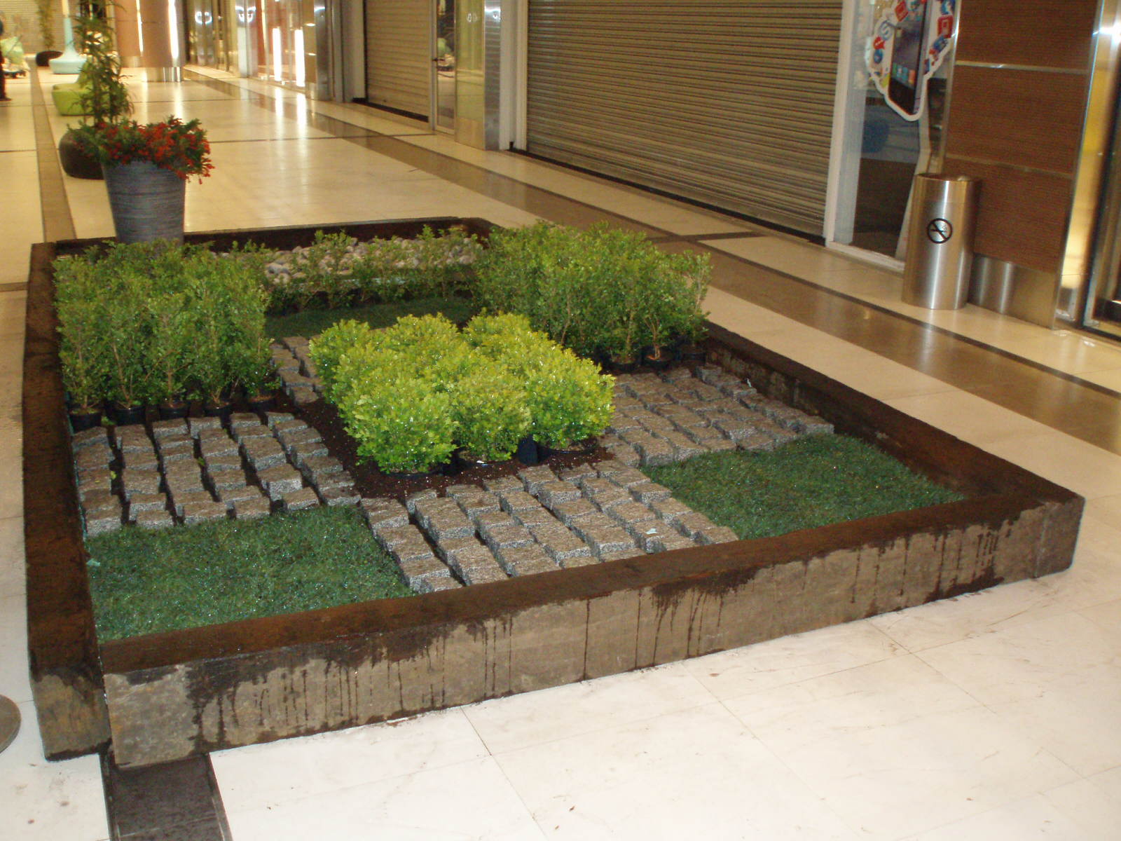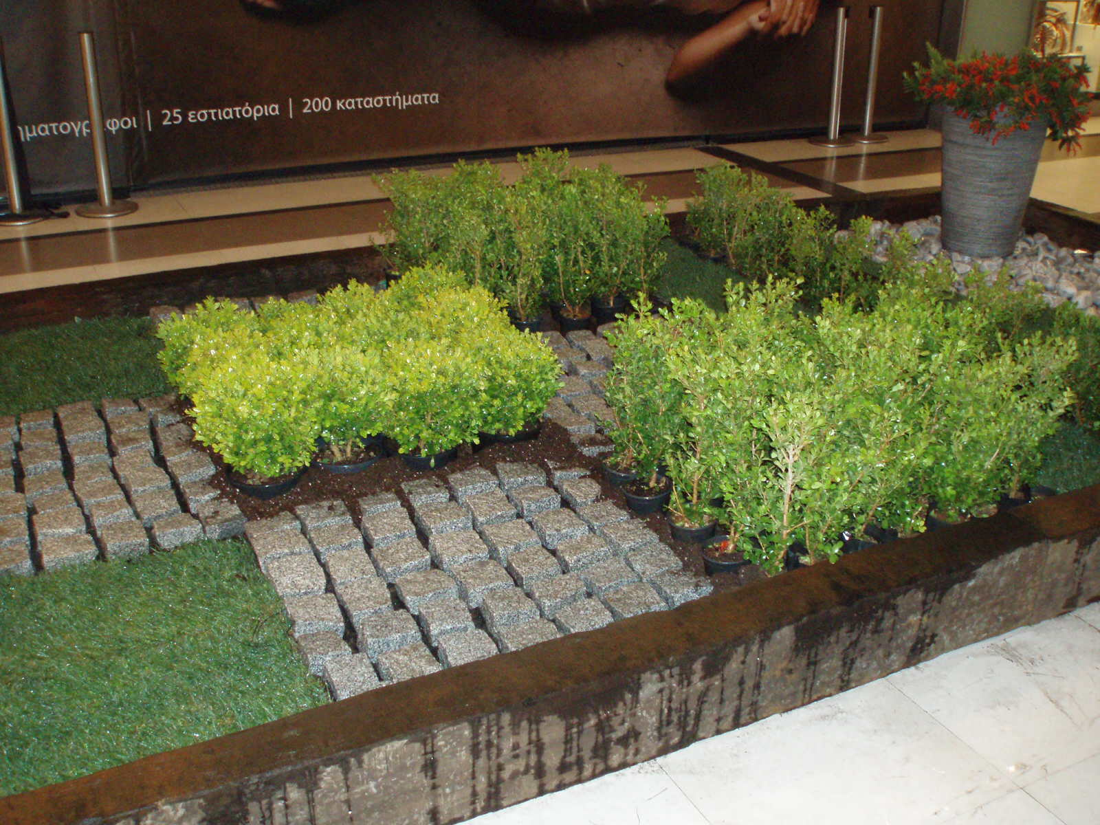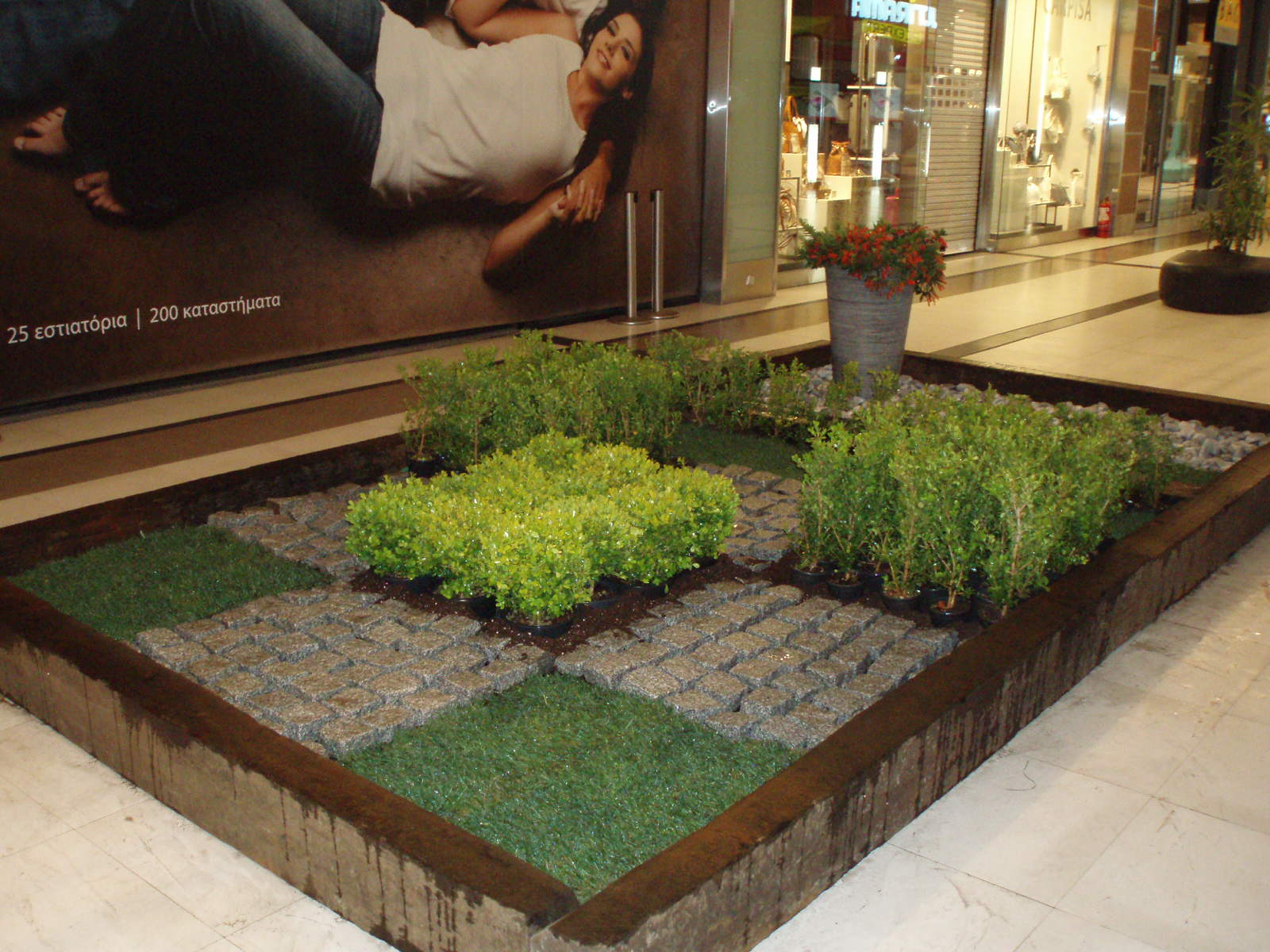 Τ α τελευταία 3 χρόνια, ένα από τα μεγαλύτερα εμπορικά κέντρα της Αθήνας, το Athens Mall στο Μαρούσι, διοργανώνει θεματικές εκθέσεις ανά περιόδους για τον στολισμό του κτιρίου, την προβολή του αλλά και την προβολή των εκθετών. Η εταιρεία μας, LandEscape, συμμετείχε σε αυτήν την διοργάνωση με την κατασκευή μιας ιδιαίτερης και εντυπωσιακής σύνθεσης, ακολουθώντας αυστηρές γραμμές, πυκνές φυτεύσεις, «παίζοντας» με τα ύψη και τους όγκους των φυτών. Η τοποθέτηση βότσαλων και ορθογωνίων πατημάτων από κυβόλιθους αναδεικνύει το φυτικό υλικό ενώ το πλαίσιο από στρωτήρες από ράγες τρένου τονίζει το αυστηρό ύφος της κατασκευής.